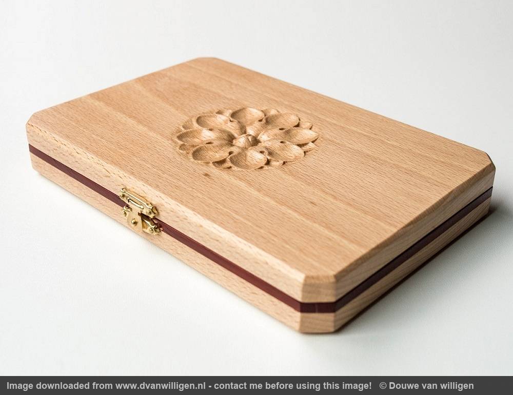 A very compact jewelry box that I made for my girlfriend. It was made as flat as possible so it could easily be used as a travel case.The flower relief was made using my CNC machine. The decorative strip of wood is padouk.