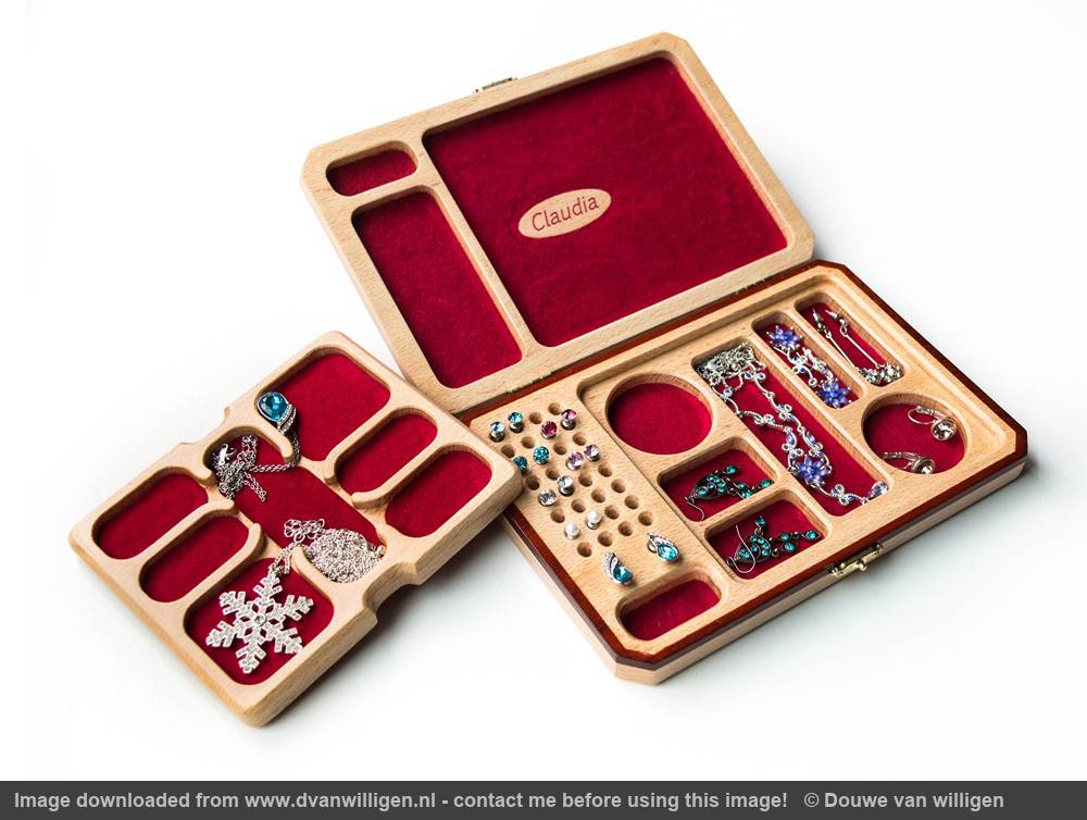 The inside of the jewelry box is covered in red felt to protect the jewelry. The removable tray fits inside the box to store some extra necklaces.The cutouts are made with my CNC machine as well.